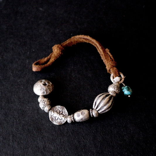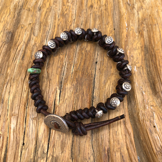 Hilltribe Silver Beads, Arizona Turquoise On Dark Brown Leather Cord