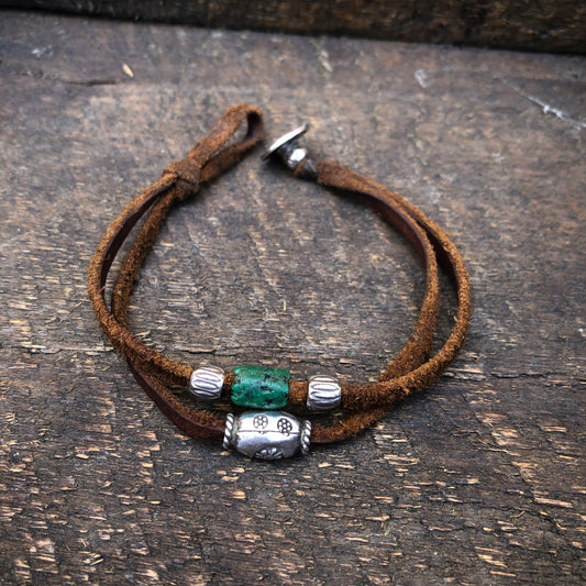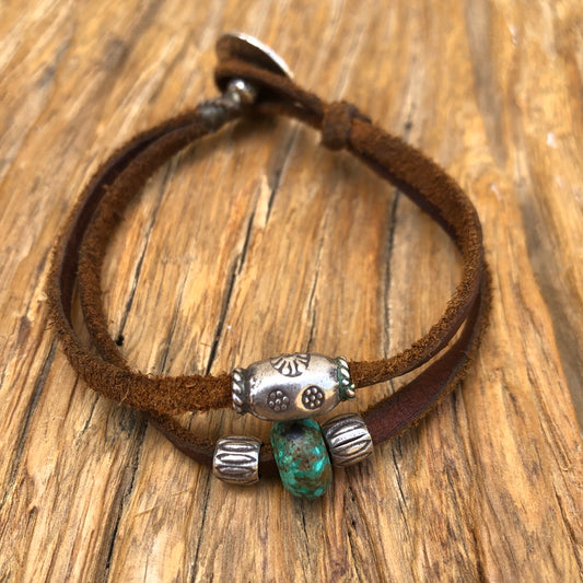 Silver Beads & Turquoise On Brown Leather Bracelet