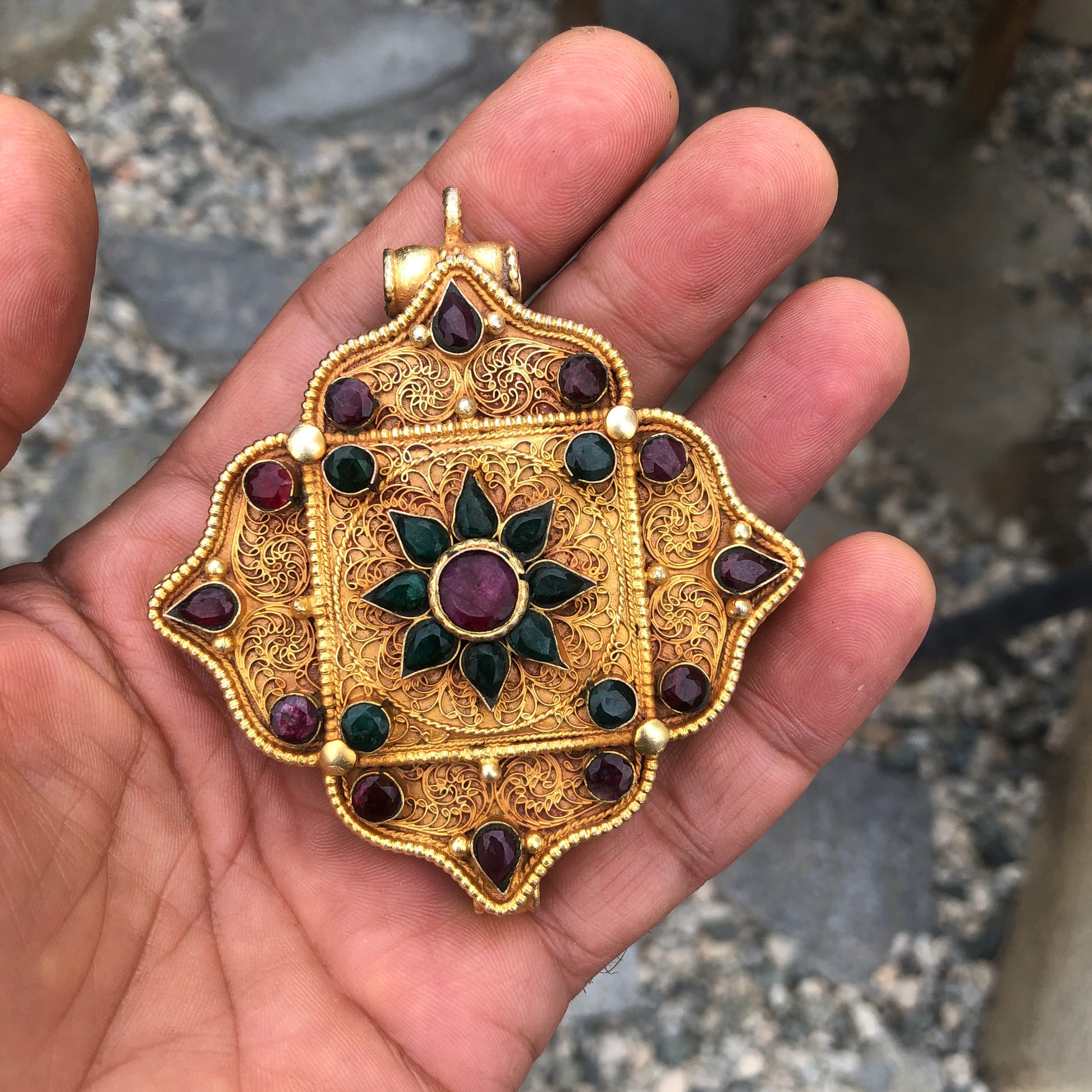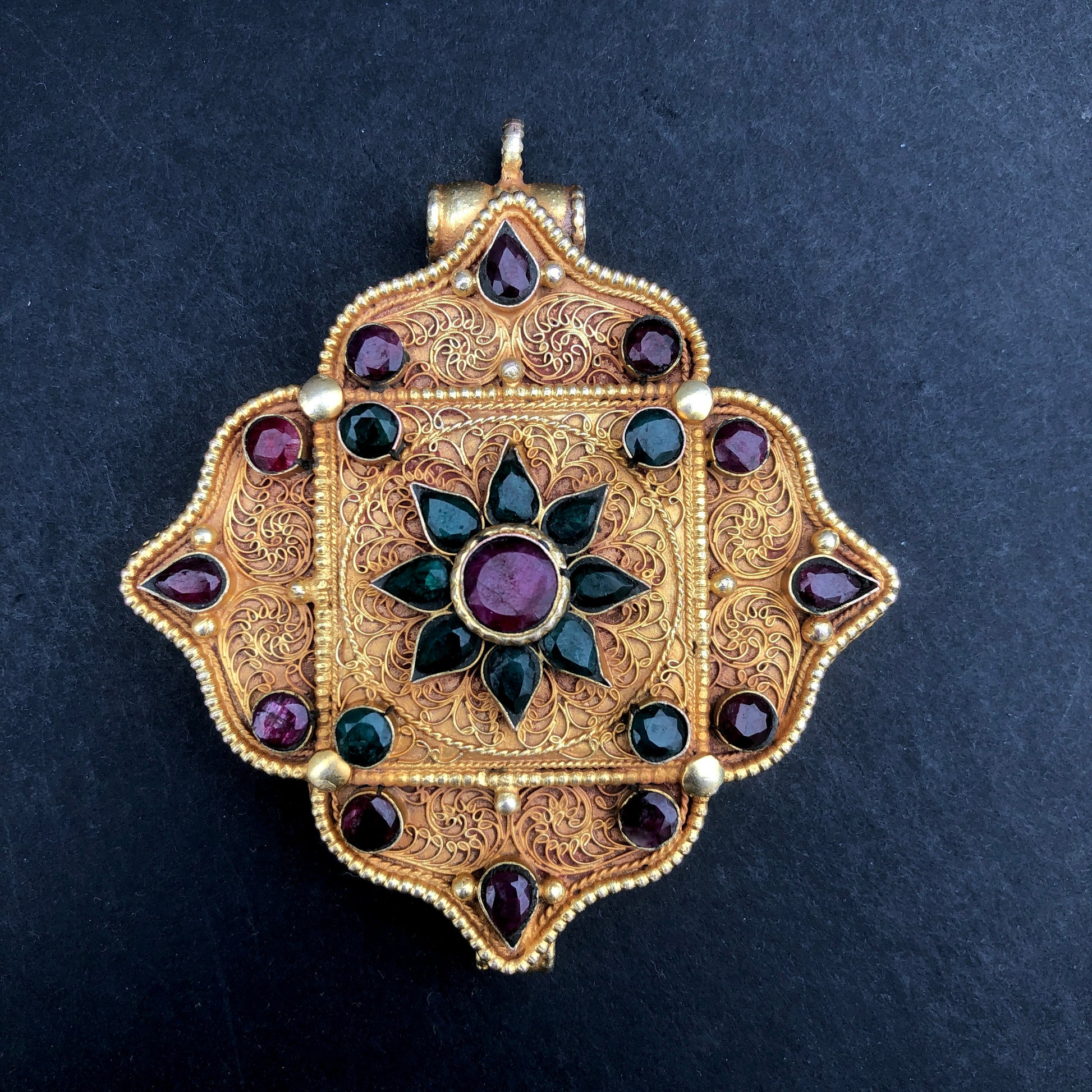 Decorated with rubies and emeralds gold plated Tibetan Ghau Prayer Box Pendant